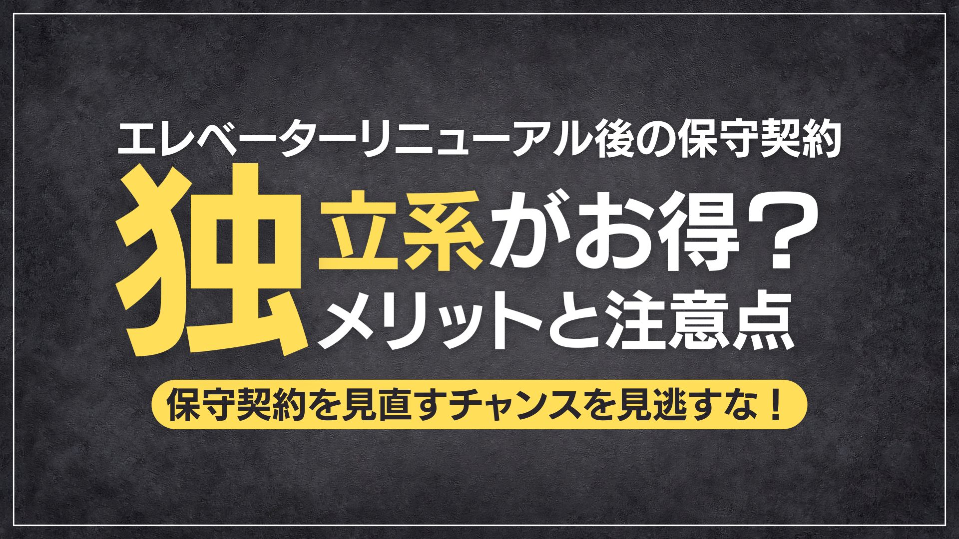 エレベーターのリニューアル(改修工事)を行った後、どの会社と保守契約を結ぶかは長期的な維持費やサービス内容に大きく影響します。多くのマンションではリニューアル前からメーカー系保守会社と契約しているケースが多いですが、独立系の保守会社に乗り換えることでコストダウンや柔軟なサービス提供が期待できる場合があります。本記事では、エレベーターリニューアル後の保守契約を独立系にするメリットと、検討時の注意点を解説します。管理組合・オーナーの皆様が後悔しない選択をするための参考になれば幸いです。